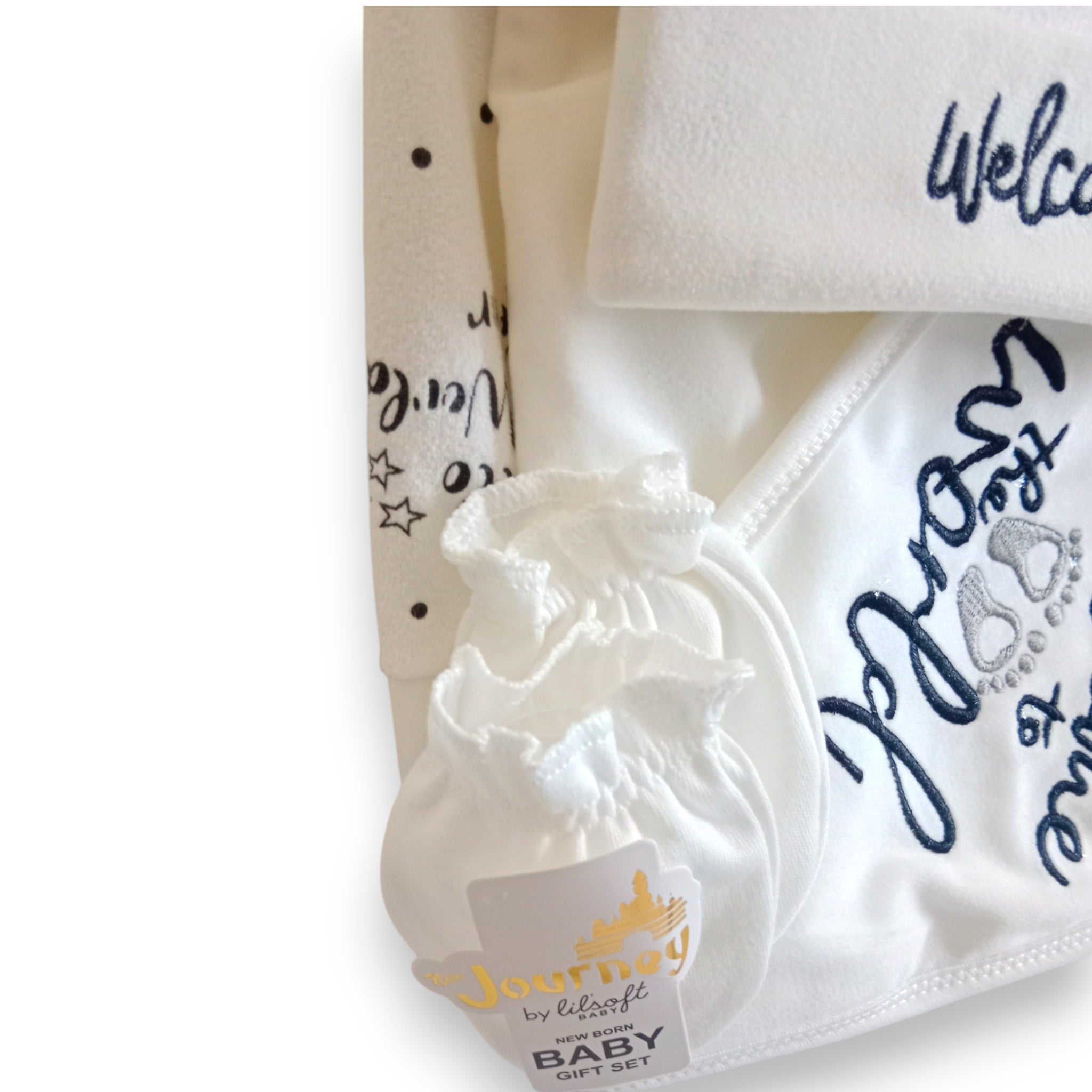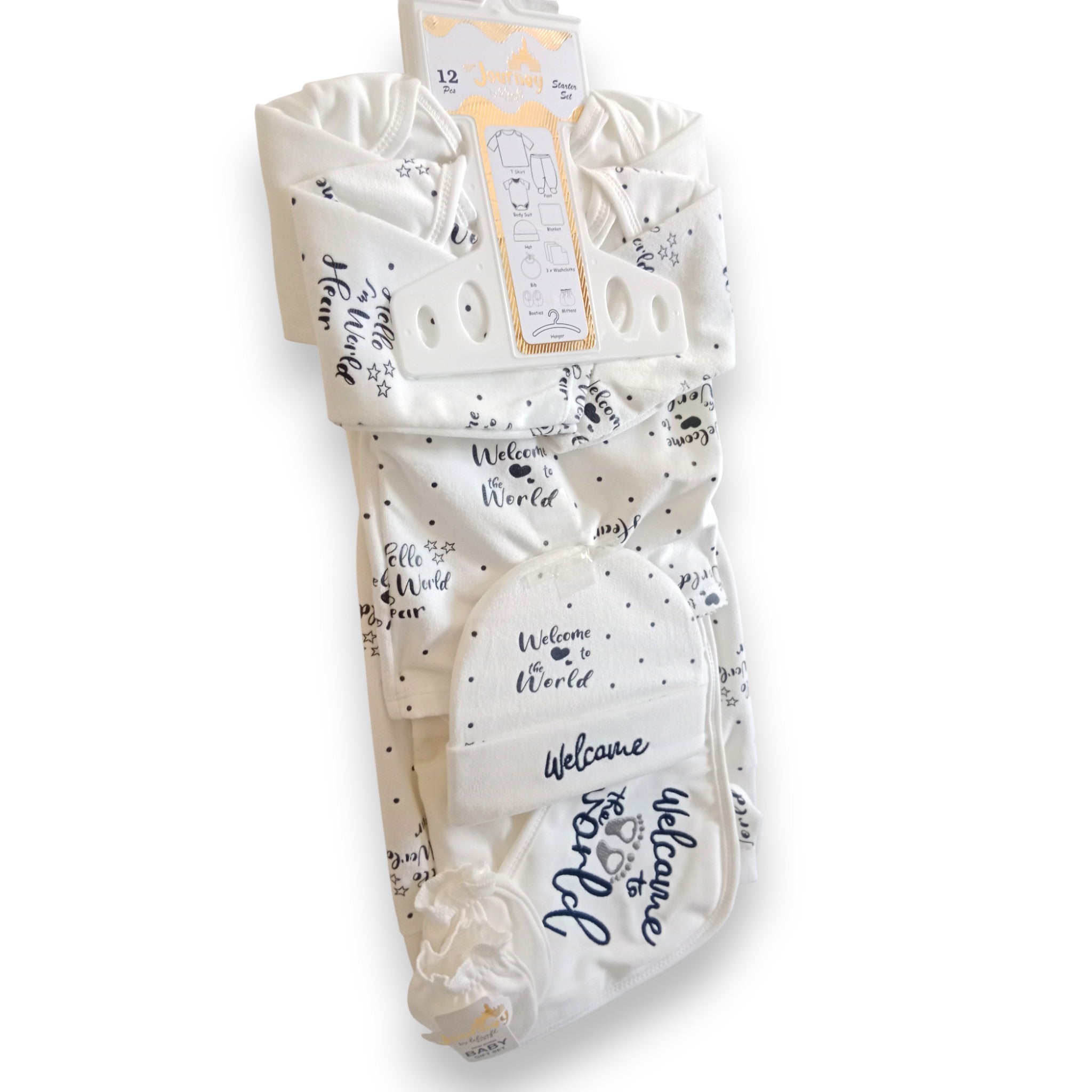 Complete 12-Piece Set: Includes a comprehensive range of newborn essentials, such as a bib, hat, wraps/blankets, and clothing items, all coordinated with the "Welcome to the World" theme.
