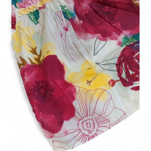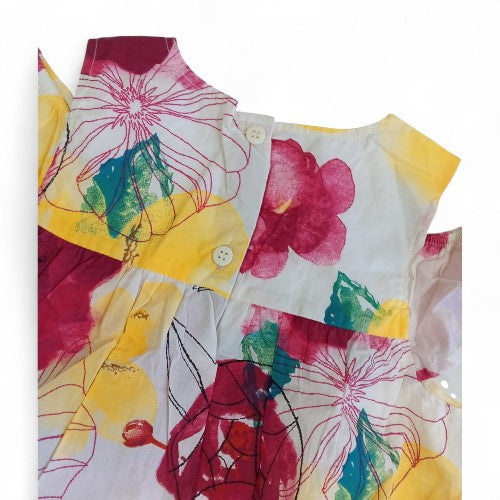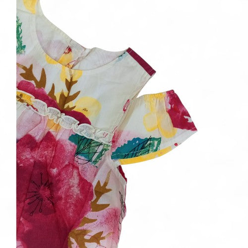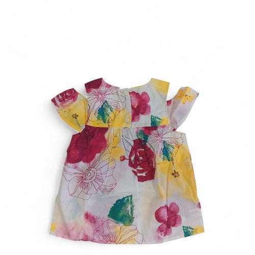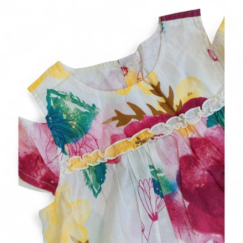This whimsical and stylish cold-shoulder top is the perfect piece for your little one's wardrobe. The lightweight, breathable fabric features a vibrant watercolor-style floral print in shades of fuchsia, yellow, and green, making it a cheerful and eye-catching garment. The top has a comfortable, loose fit that allows for plenty of movement and play.