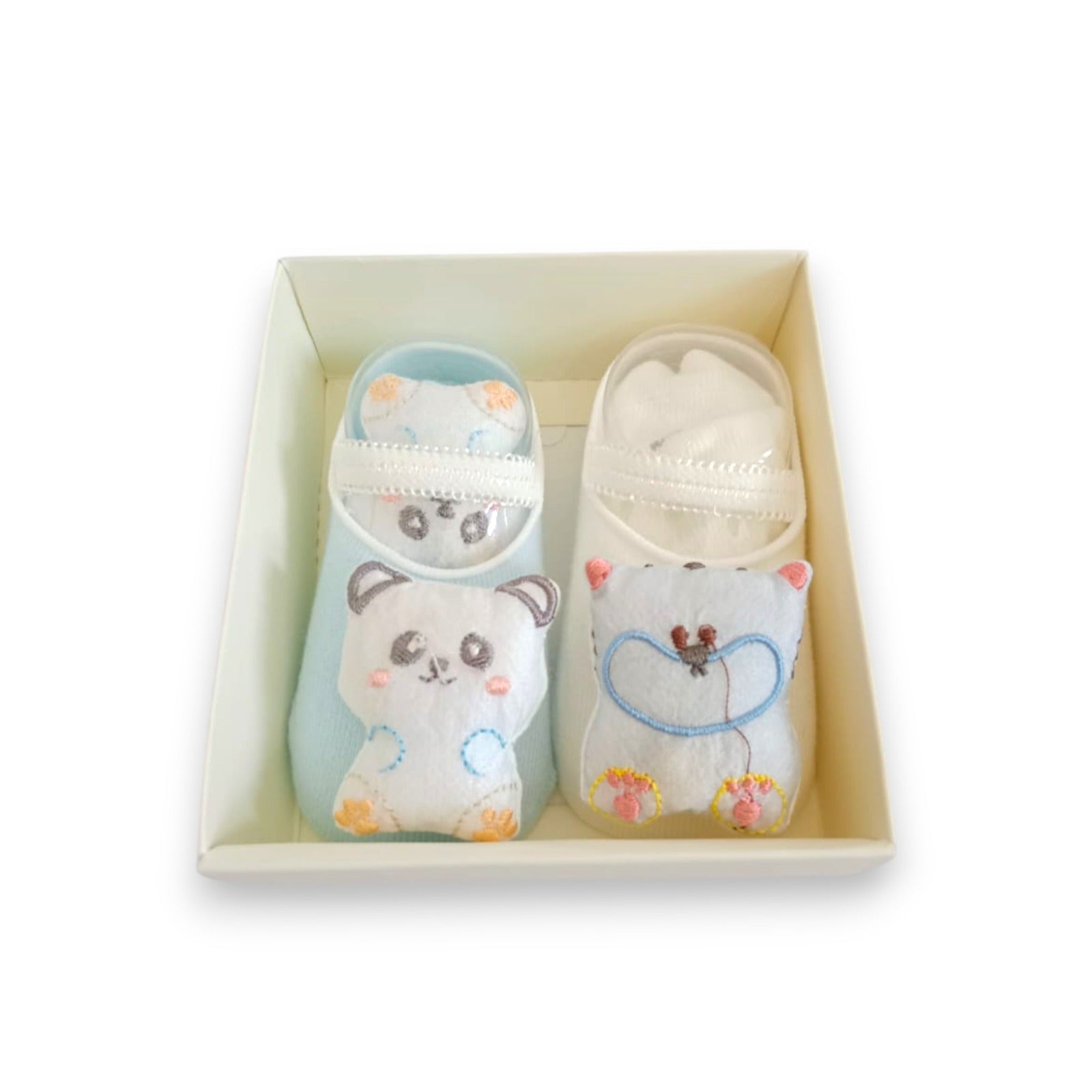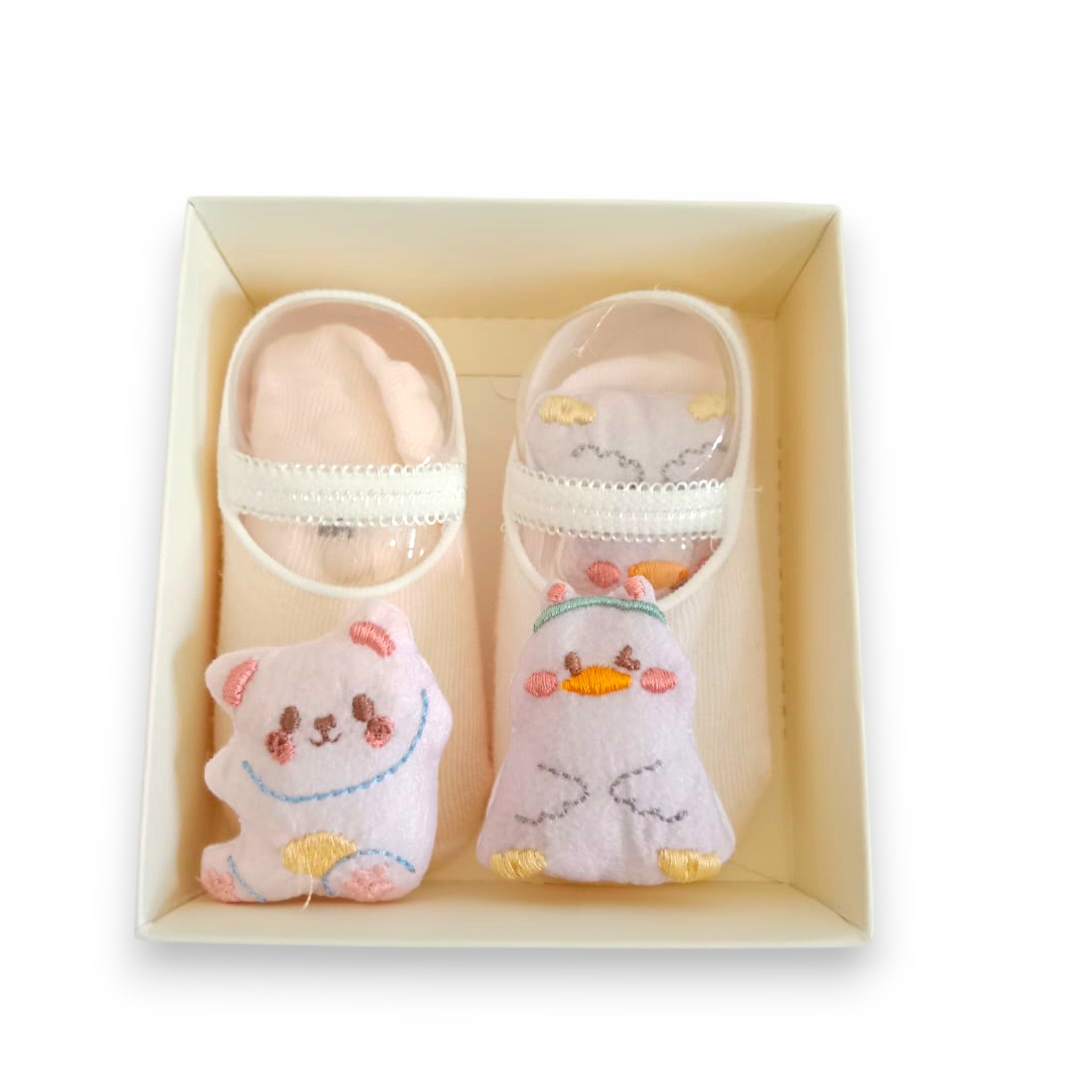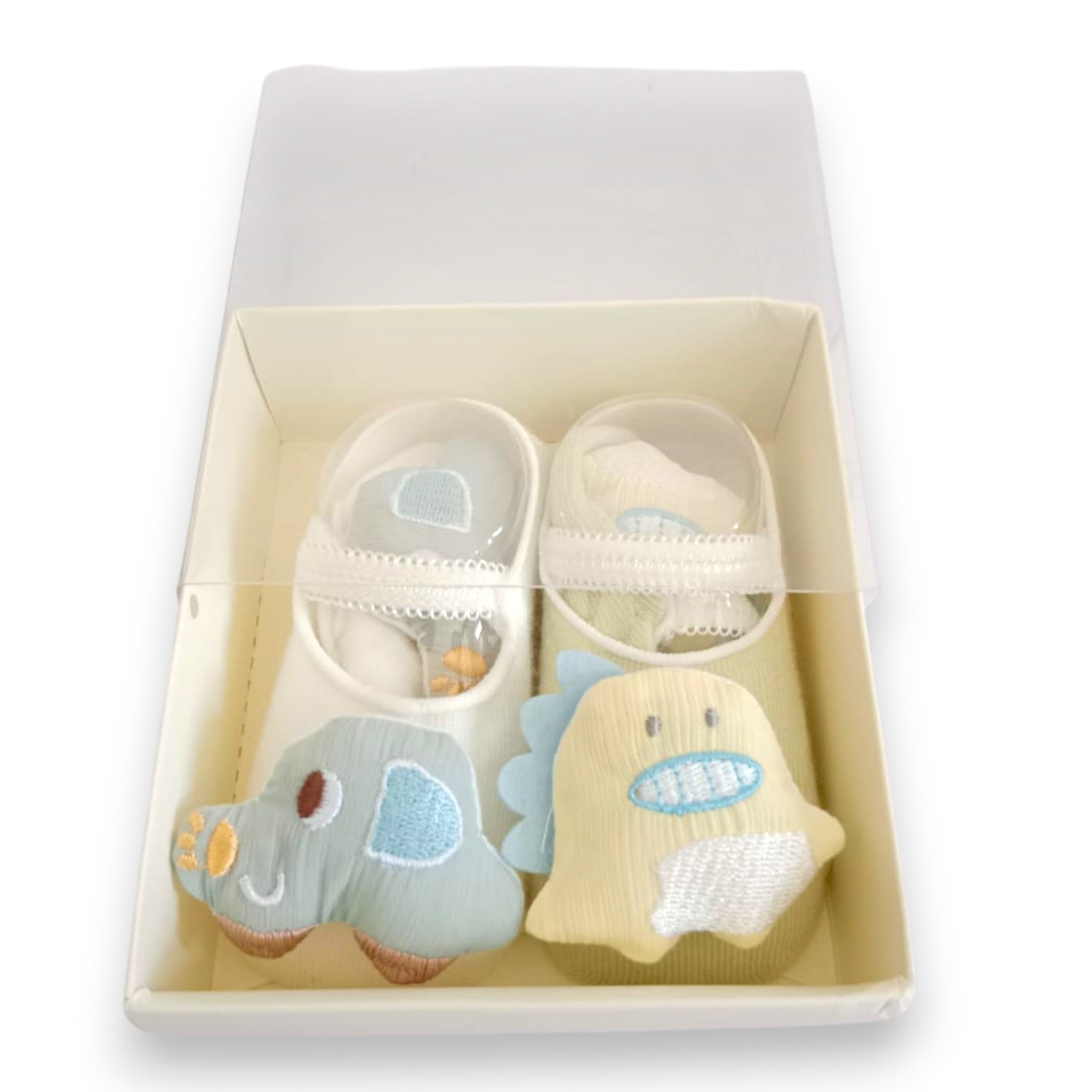 Product Description: Delight a new parent or celebrate a baby shower with this charming and practical baby gift set! This carefully curated collection features cozy essentials and delightful playtime companions for little ones. Premium Comfort Socks: Two pairs of soft, breathable, and gentle-on-skin baby socks, designed for comfort and warmth. The anti-slip sole ensures tiny feet stay secure during early movements, while the elastic cuff provides a snug fit without constriction. Colors include a soothing light blue and a versatile cream. Thoughtful Presentation: Presented in an attractive gift box, making it ready for gifting. The clear packaging for the socks adds a touch of elegance and allows a peek at the contents. Ideal for: Newborns, infants, baby shower gifts, welcome baby presents, or a thoughtful addition to any baby's wardrobe and toy collection. Features: *Soft, breathable, and skin-friendly materials. *Anti-slip soles on socks for safety. *Cute and engaging animal plush toys (duck and elephant). *Beautifully packaged, perfect for gifting. *Suitable for both baby boys and girls. *Care Instructions: Machine wash socks on a gentle cycle. Spot clean plush toys as needed.