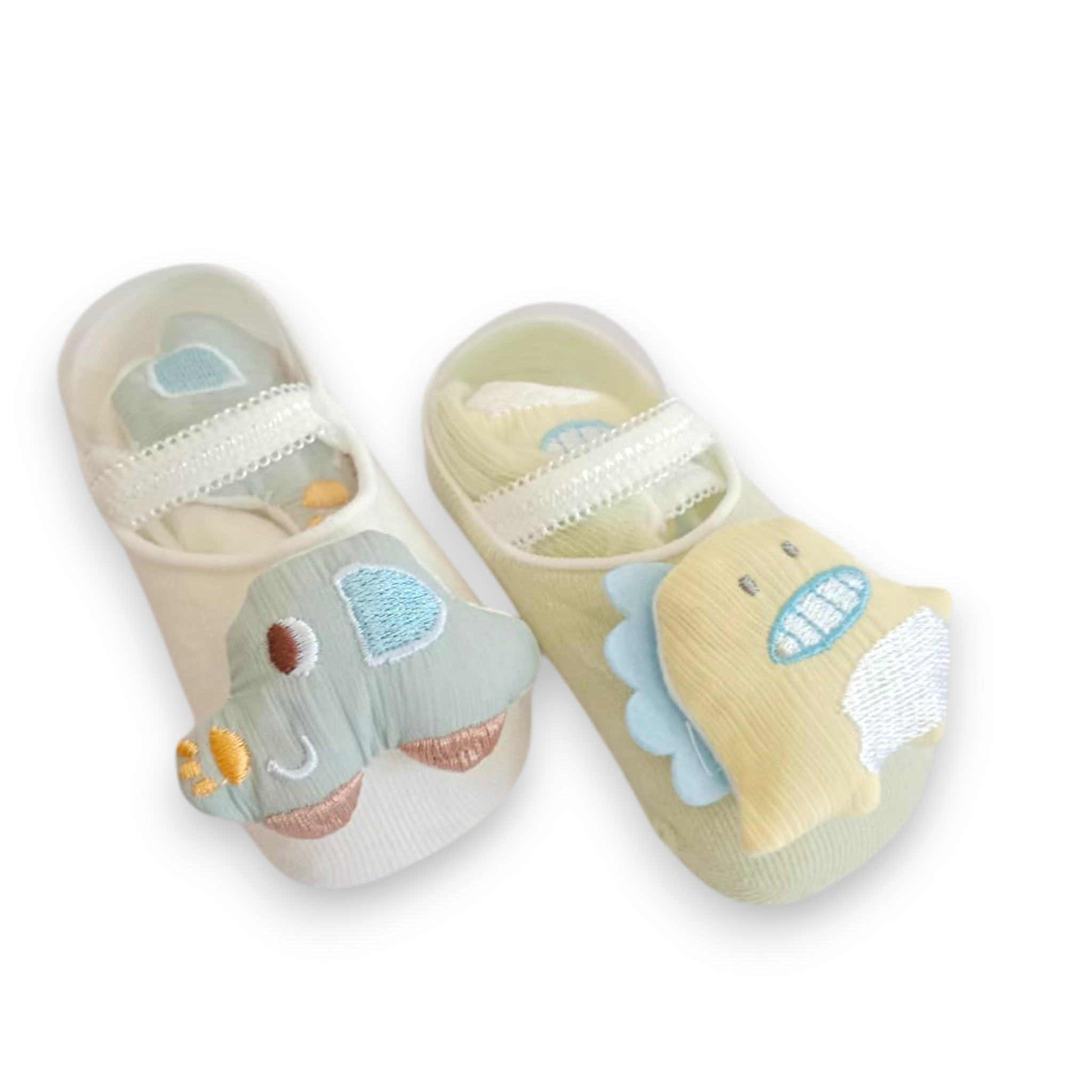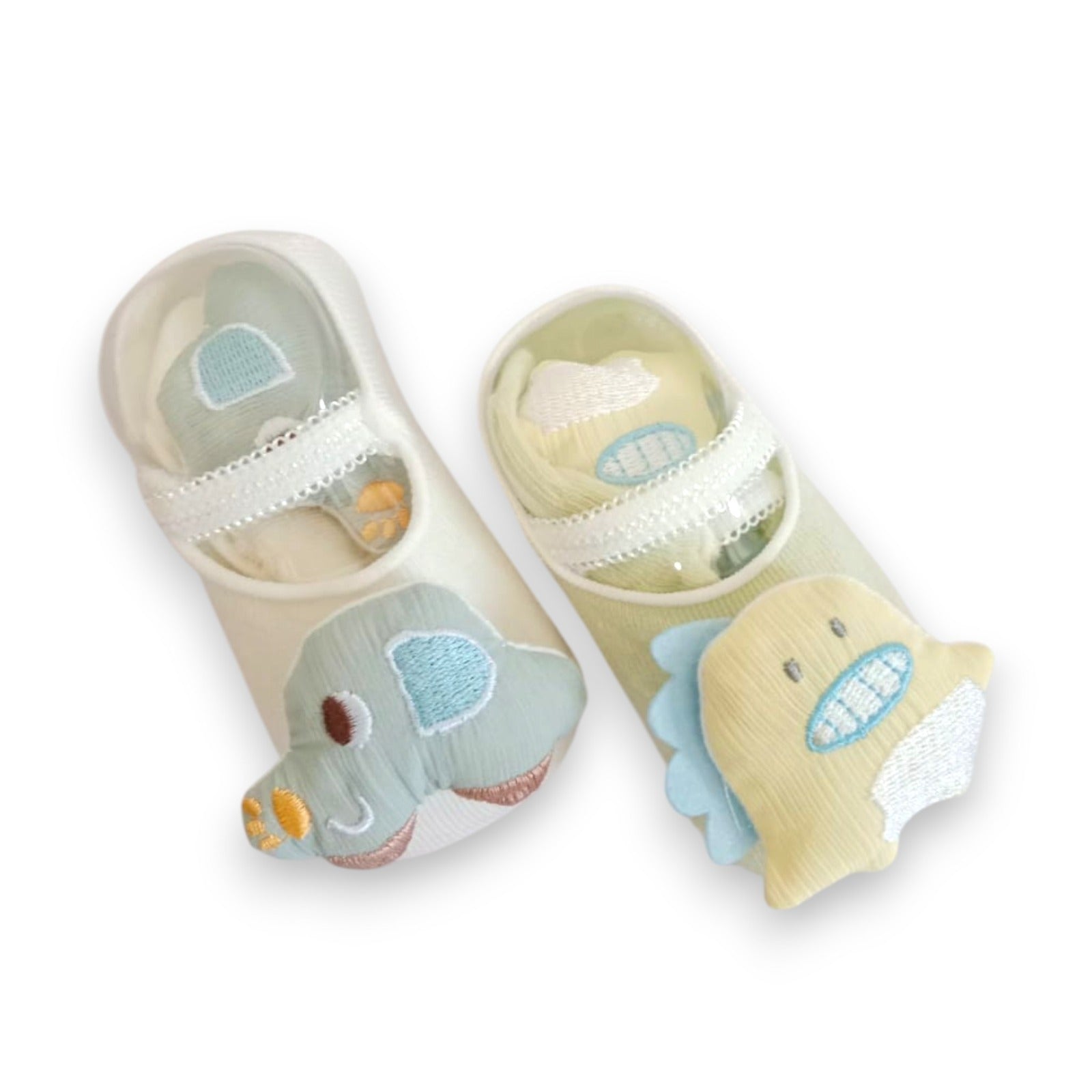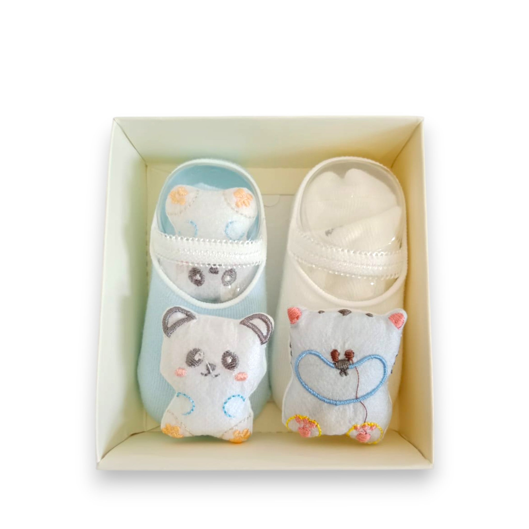 Product Description: Delight a new parent or celebrate a baby shower with this charming and practical baby gift set! This carefully curated collection features cozy essentials and delightful playtime companions for little ones. Premium Comfort Socks: Two pairs of soft, breathable, and gentle-on-skin baby socks, designed for comfort and warmth. The anti-slip sole ensures tiny feet stay secure during early movements, while the elastic cuff provides a snug fit without constriction. Colors include a soothing light blue and a versatile cream. Thoughtful Presentation: Presented in an attractive gift box, making it ready for gifting. The clear packaging for the socks adds a touch of elegance and allows a peek at the contents. Ideal for: Newborns, infants, baby shower gifts, welcome baby presents, or a thoughtful addition to any baby's wardrobe and toy collection. Features: *Soft, breathable, and skin-friendly materials. *Anti-slip soles on socks for safety. *Cute and engaging animal plush toys (duck and elephant). *Beautifully packaged, perfect for gifting. *Suitable for both baby boys and girls. *Care Instructions: Machine wash socks on a gentle cycle. Spot clean plush toys as needed.