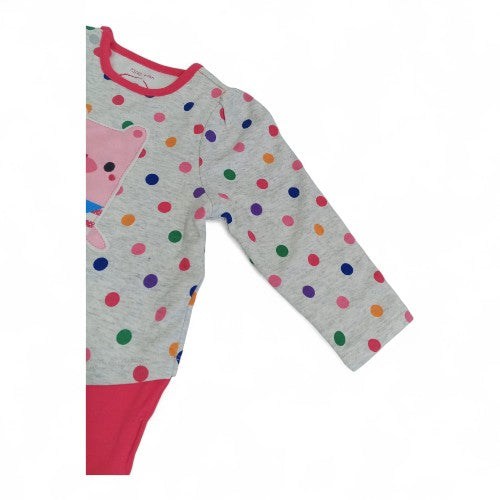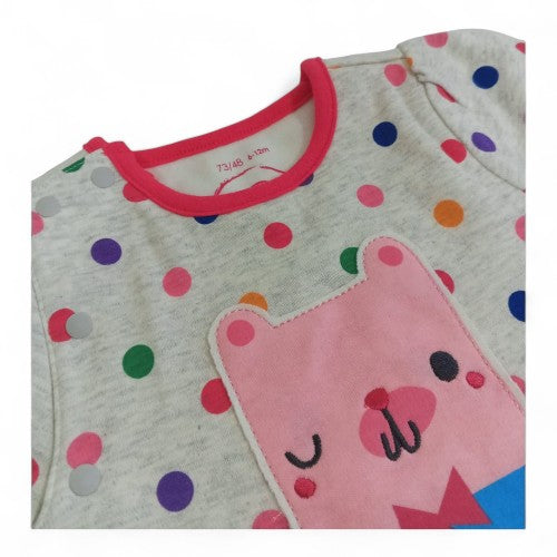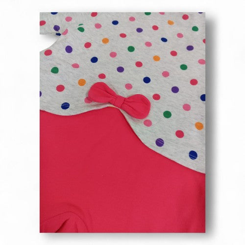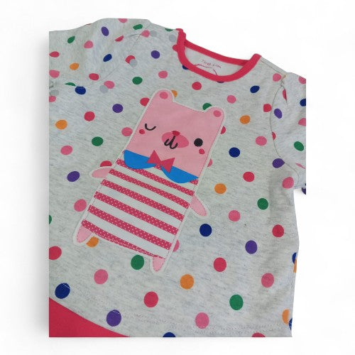 Design:A combination of a polka dot top and solid pink bottom with a cute bear graphic.