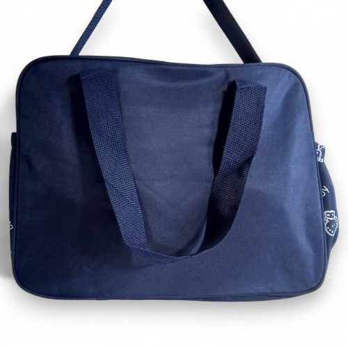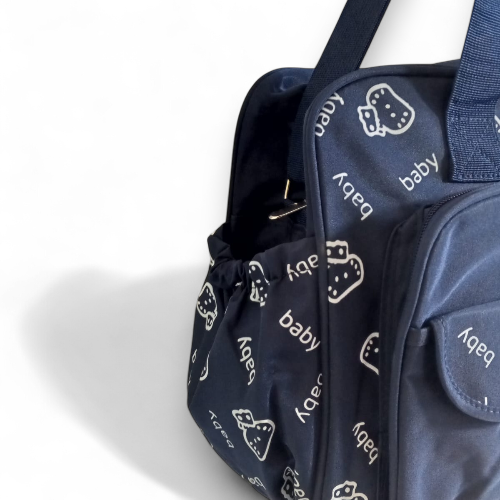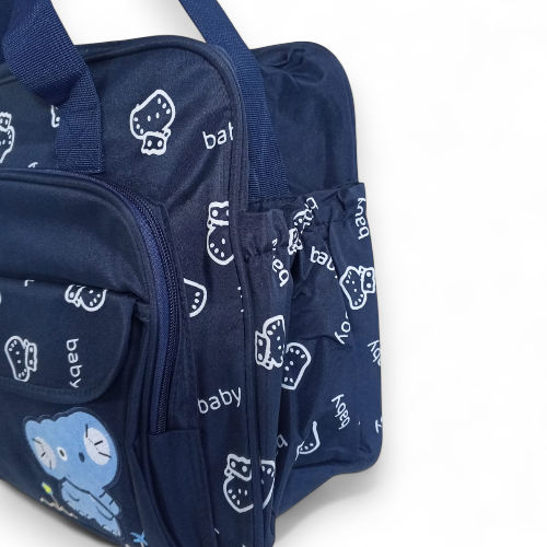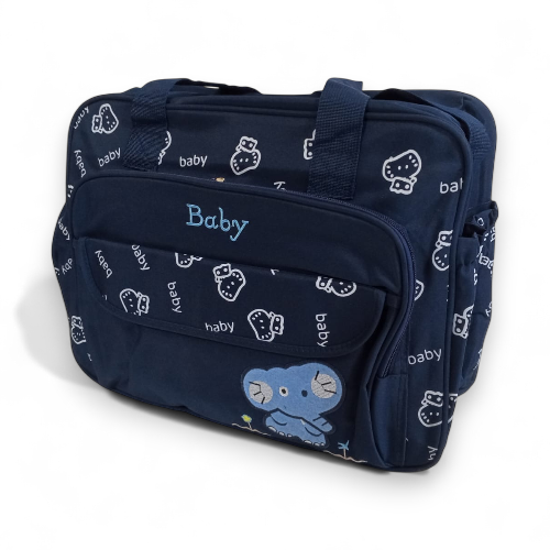 Product Description: Carry all your baby's essentials in style with this charming navy blue baby diaper bag, also known as a mommy bag. Featuring a playful elephant appliqué and repeated "baby" and strawberry/berry patterns, this bag is as cute as it is functional. Designed for convenience, it's perfect for carrying diapers, bottles, clothes, and other daily necessities for your little one on the go. The durable material and spacious design make it an ideal travel companion for parents. Key Features: Cute Design: Features an embroidered blue elephant appliqué and all-over "baby" and berry/strawberry print. Spacious Interior: Ample room to organize baby essentials like diapers, wipes, bottles, and extra clothing. Durable Material: Constructed to withstand daily use and travel. Convenient Carrying: Equipped with comfortable handles for easy transport. Versatile Use: Functions as a diaper bag, mommy bag, or general baby travel bag. Color: Navy Blue with multi-color accents (blue elephant, white/red berries, white text). Material: Durable fabric, possibly polyester or nylon.