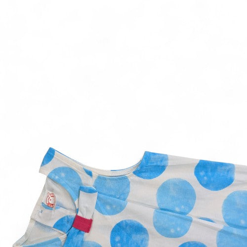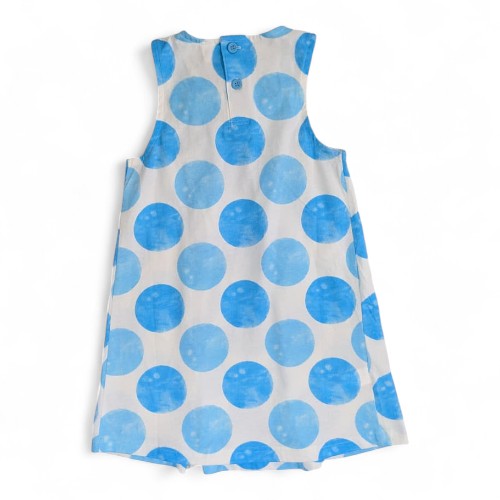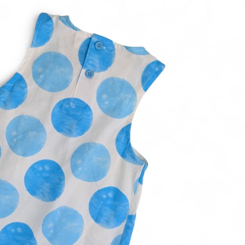 This charming sleeveless dress is perfect for a stylish and playful look. The white fabric is adorned with a fun polka dot pattern in two shades of blue, creating a dynamic and eye-catching design. The dress features a pleated A-line cut, which provides a comfortable and flattering fit that allows for easy movement. A vibrant magenta and blue bow on the neckline adds a pop of color and a touch of elegance. Made from a light and airy fabric, this dress is ideal for warm weather and various occasions, from casual outings to special events.