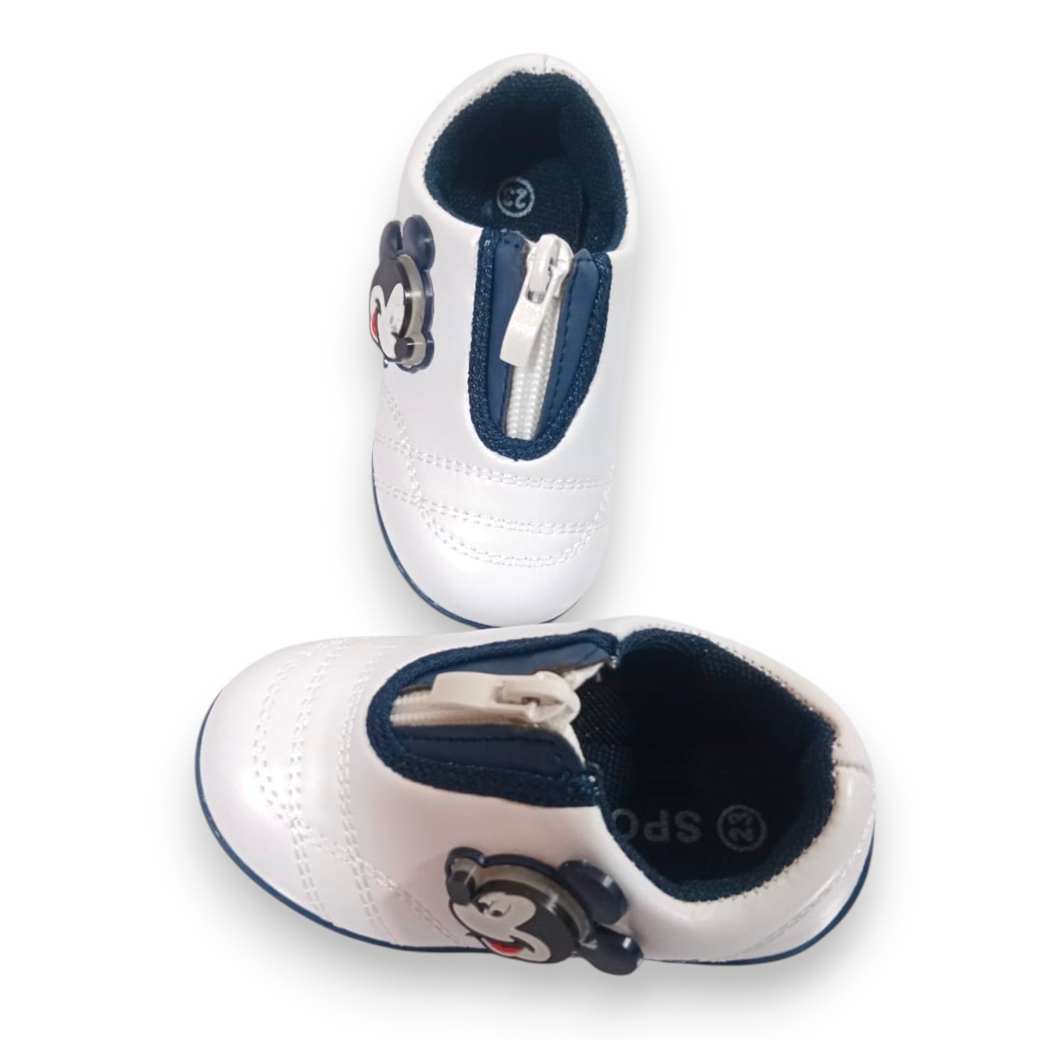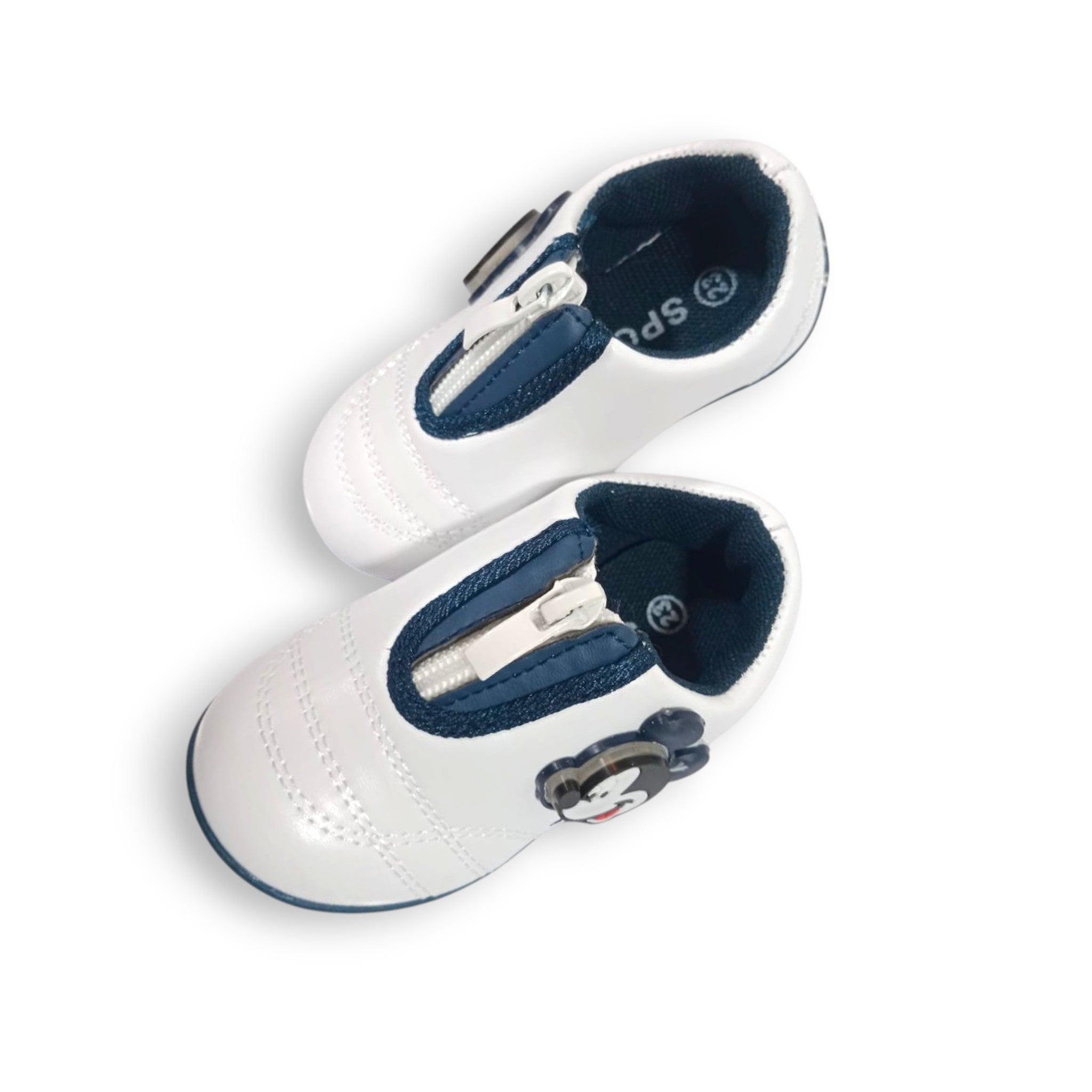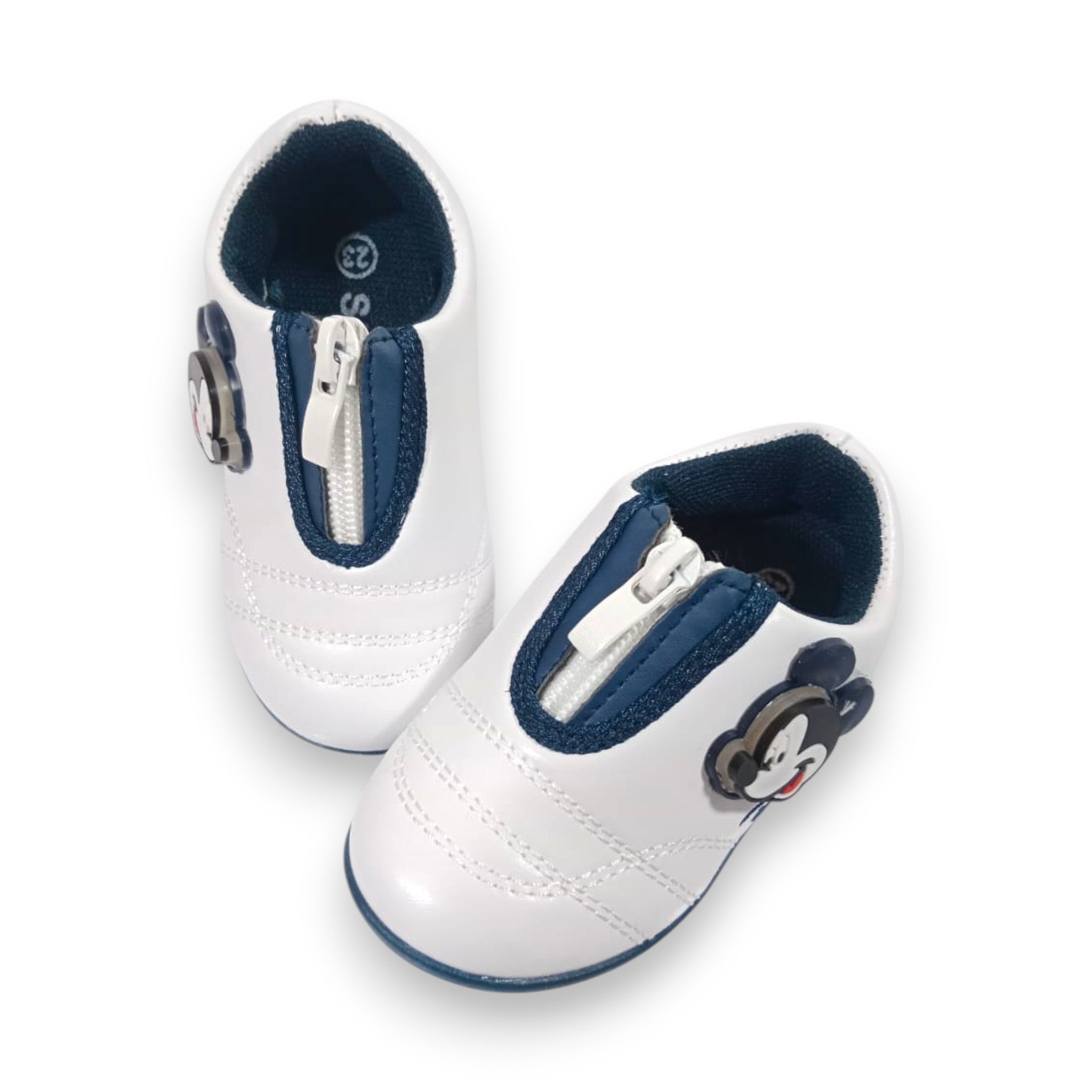 Design: White and navy blue color scheme, iconic Mickey Mouse emblem on the side, quilted stitching details on the toe area, convenient zipper closure for easy on/off.