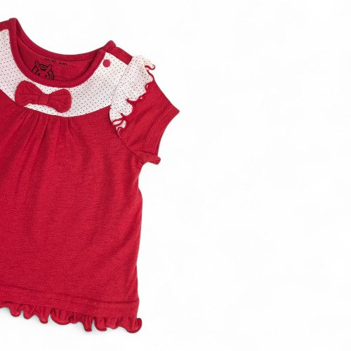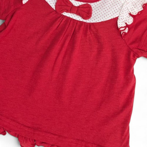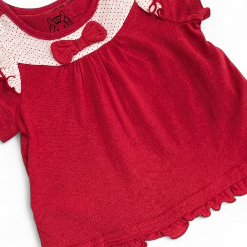 Dress your little one in this charming red top, designed for comfort and style. The top features a soft, solid red body and short sleeves, providing a classic and vibrant look. The neckline is accented with a delicate white bib-style panel adorned with subtle polka dots and trimmed with playful white ruffles. A sweet red bow sits at the center of the chest, adding a cute and elegant detail. This top is perfect for any occasion, from casual outings to special family events.