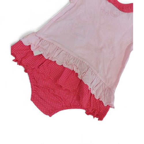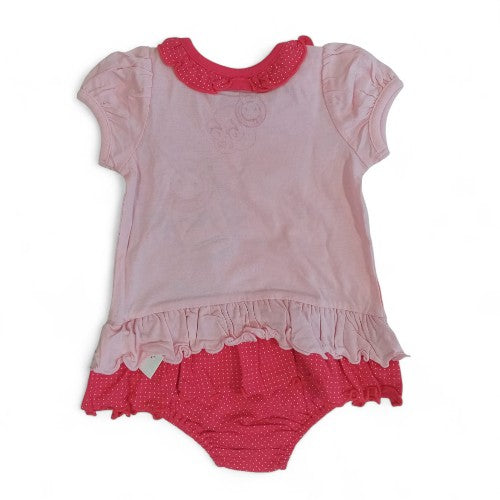 Details:Short sleeves, ruffled hem, ruffled collar with a dotted pattern, and a graphic of three bunnies with googly eyes on the center one.