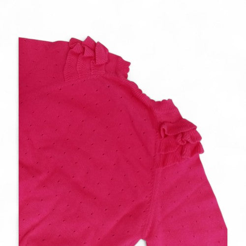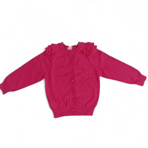 A Touch of Sweet Style:This charming fuchsia-colored cardigan is a perfect layering piece for any little girl's wardrobe. The vibrant color and delicate ruffles along the shoulder seams add a playful, stylish touch.