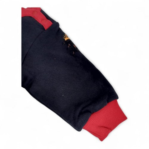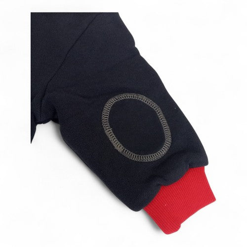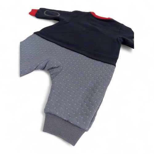Two-Tone Style:The romper is designed with a classic two-tone aesthetic, featuring a navy blue top and a gray quilted bottom, highlighted with red trim around the collar and cuffs.