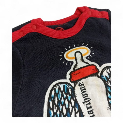 Whimsical Graphic Design:The standout feature is a cute and detailed graphic of a winged baby bottle adding a fun and memorable element to the garment.