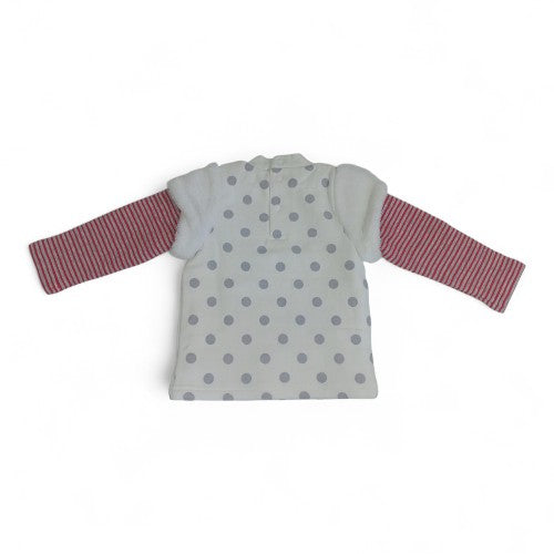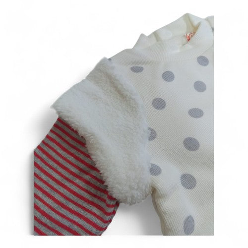 Dress your little one in cozy and adorable style with this charming long-sleeve top. This unique piece features a whimsical design that combines playful polka dots on the body with cheerful red and white striped sleeves. The highlight is the super-soft, fluffy reindeer appliqué on the front, complete with a bright pink nose and embroidered details, making it perfect for the holiday season or everyday fun.