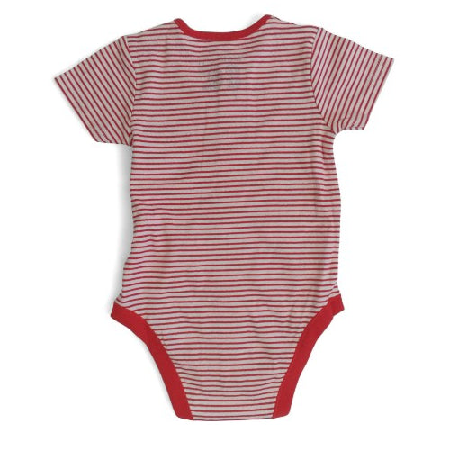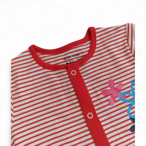 This adorable and comfortable short-sleeve bodysuit is perfect for your little one's everyday adventures. Made from soft, breathable fabric, it features a classic red and white stripe pattern that is both stylish and timeless. The solid red trim around the collar, sleeves, and legs adds a pop of color, while the three delicate floral appliqués on the chest bring a sweet, playful touch.