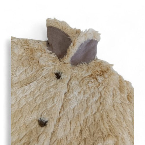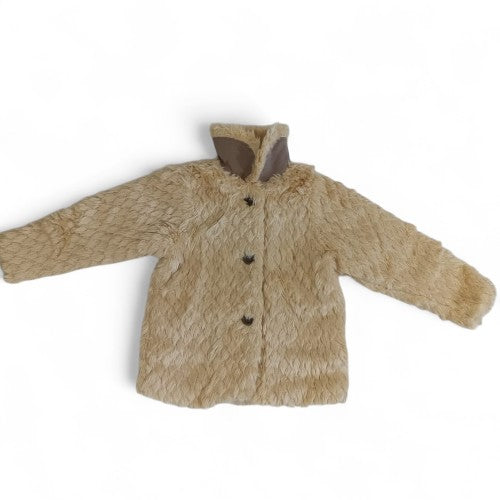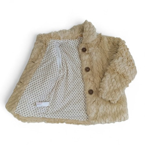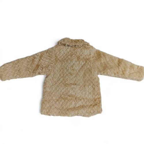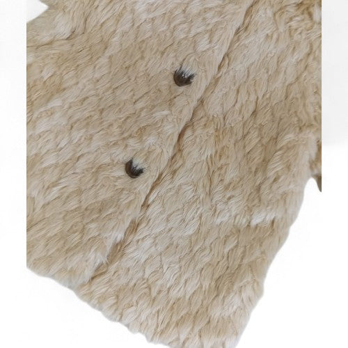 Product Description: Wrap your little one in warmth and timeless style with this adorable faux fur jacket. Perfect for keeping them snug on chilly days, this cozy coat is designed with a soft, plush material that feels incredibly gentle and comfortable. The light beige color and subtle, textured pattern give it a classic, elegant look. The jacket features a timeless collar and a button-down front with three dark buttons, making it a practical yet fashionable outerwear piece. The inside is lined with a soft, white fabric featuring a charming polka dot pattern, adding a hidden touch of playfulness. It’s an ideal choice for adding a touch of cozy elegance to any winter outfit, from casual playdates to special family events.