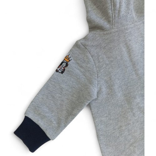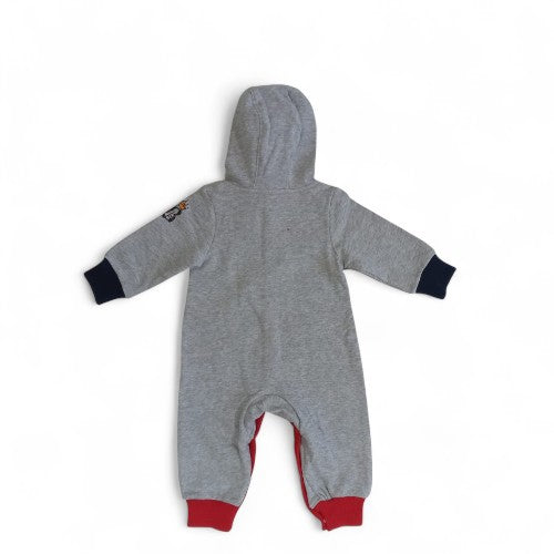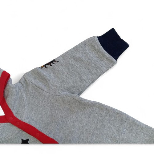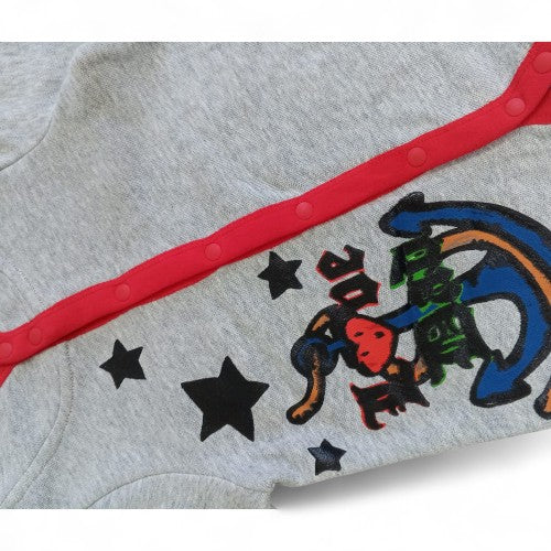 Playful & Cozy Design:This adorable hooded romper is perfect for both playtime and naptime. The gray fabric is accented with red trim and a fun, colorful graphic of a rocking horse with a crown, surrounded by stars. It's a whimsical outfit for any baby.