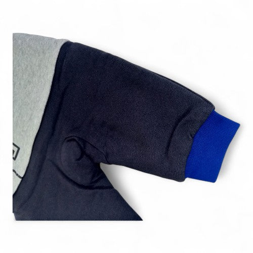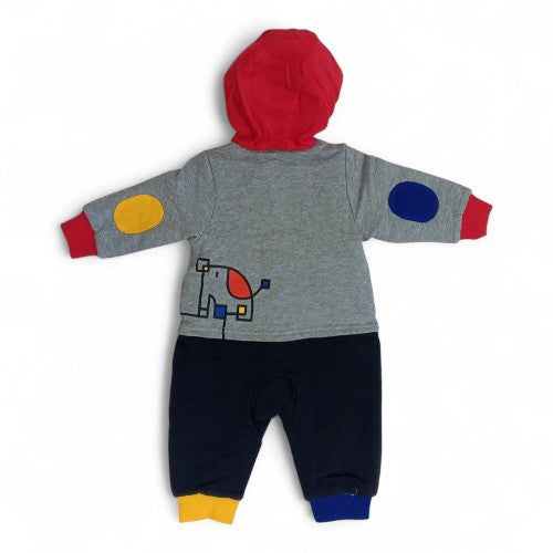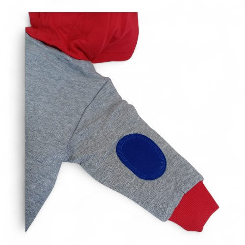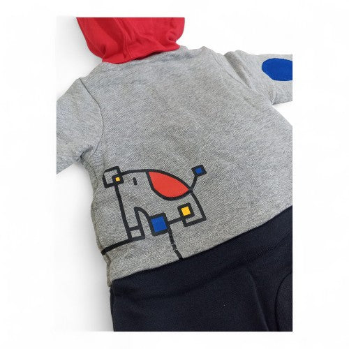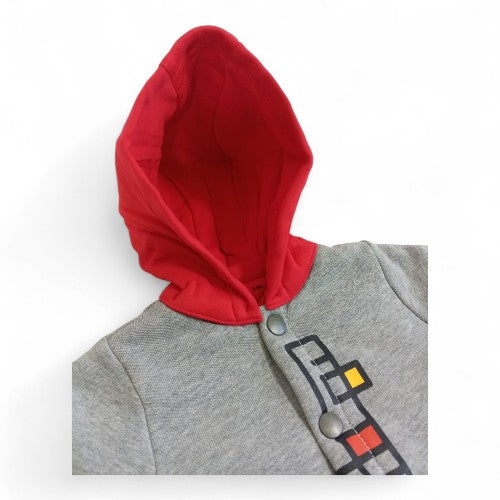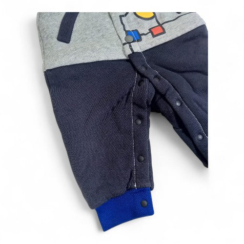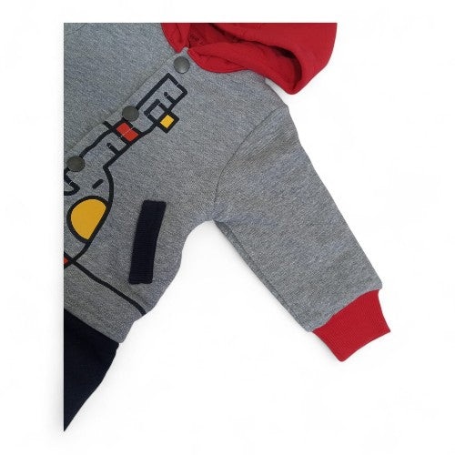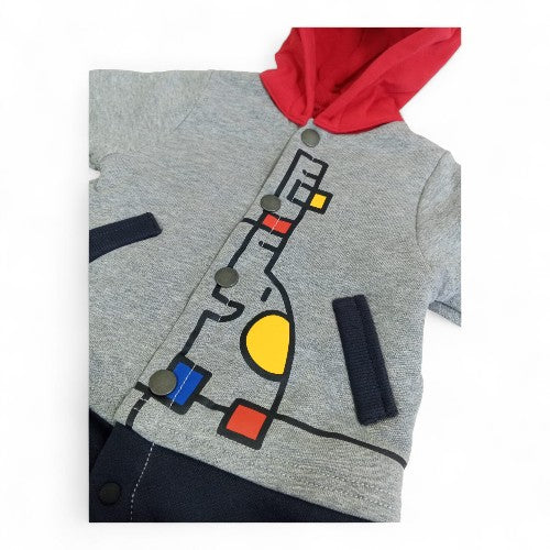 Product Description: Dress your little one in a playful and artistic style with this cozy hooded baby jumpsuit. This one-piece is a perfect blend of comfort and modern design, featuring a gray top section with a unique geometric robot or machine-like appliqué. The abstract design uses bold blocks of yellow, red, and blue, creating a vibrant, modern look. The bottom half is a solid navy blue, providing a stylish contrast. With a striking red hood and coordinating cuffs, this jumpsuit is designed to keep your baby warm and comfortable while making a fashionable statement.