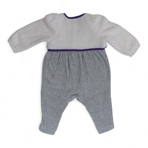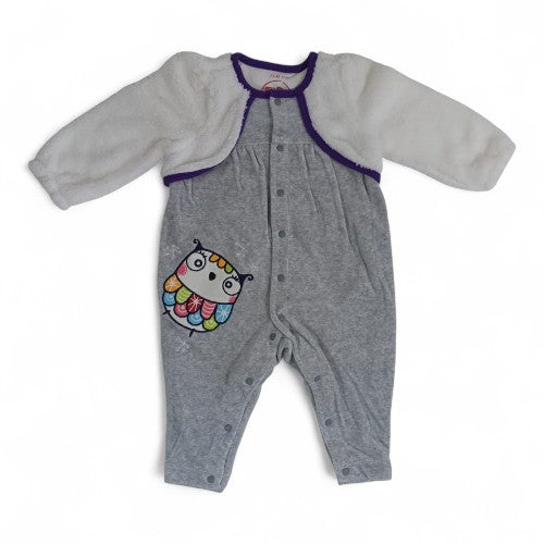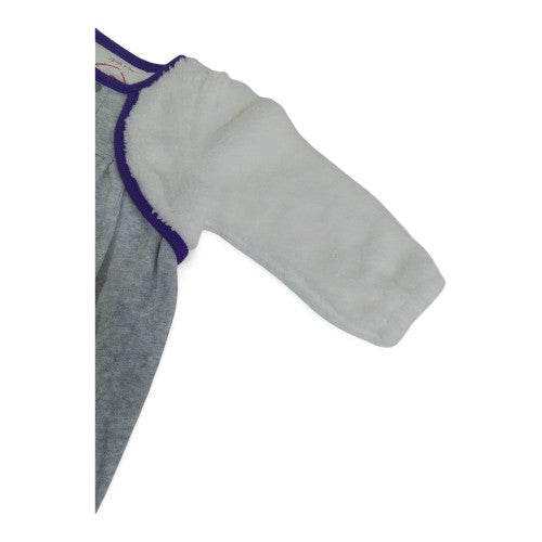 This adorable and cozy one-piece outfit is perfect for keeping your little one warm and stylish. The soft, plush fabric provides ultimate comfort for playing, sleeping, and everyday wear. The playful owl applique on the front adds a touch of whimsy, making it a delightful addition to any baby's wardrobe. The gray one-piece is complemented by a separate white fleece bolero, offering a layered look that can be worn together for warmth or individually. With convenient snap closures, diaper changes are a breeze.