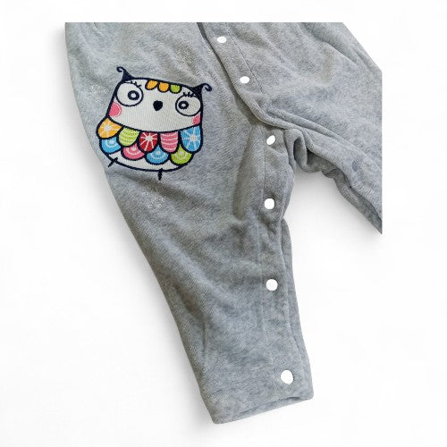 Design: Gray long-sleeved one-piece romper with a vibrant, embroidered owl applique and snap closures.