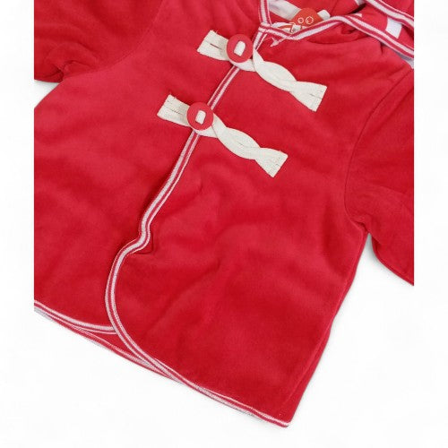 This adorable red jacket is a perfect blend of style and comfort for your little one. The vibrant color and playful hood with little ears add a charming touch, while the soft, plush fabric ensures your baby stays warm and cozy on cooler days. The classic toggle button closure makes for easy dressing and adds a timeless, stylish detail.