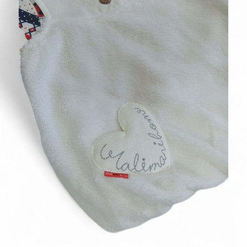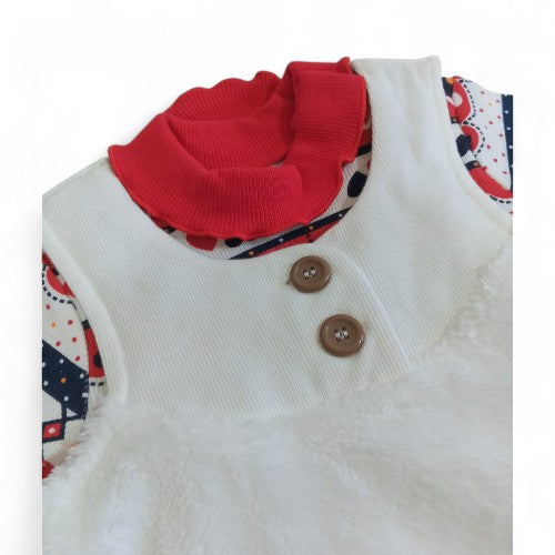 Plush Jumper Dress:The outer layer is a sleeveless, white plush jumper with two decorative wooden-style buttons and a rounded collar.