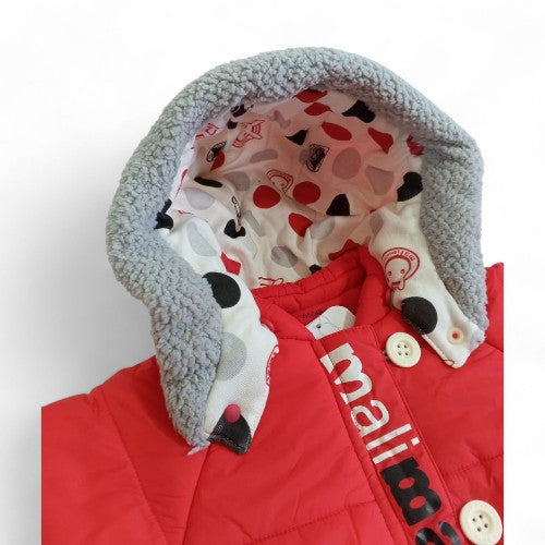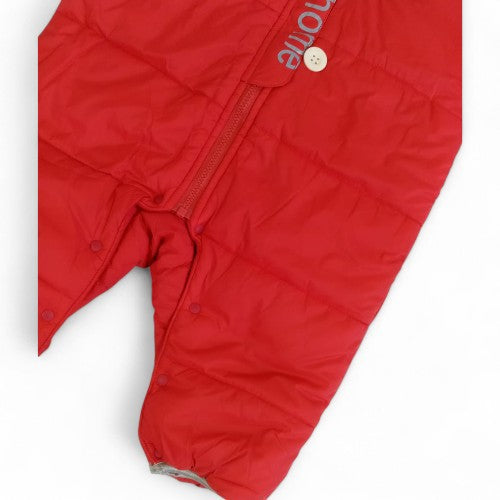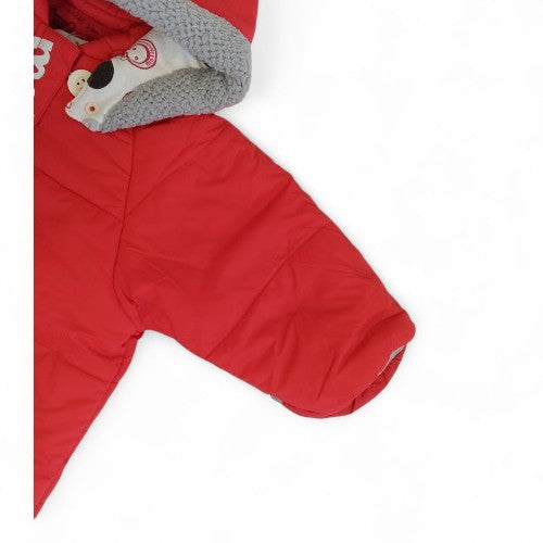 Keep your little one snug and stylish on chilly days with this cozy, padded winter jumpsuit. Made from a soft, wind-resistant material with quilted padding, this snowsuit provides a warm and comfortable layer for outdoor adventures. The cheerful red color and unique details, including a playful patterned hood lining and a charming button-up placket, make this a practical and fashionable choice for any baby or toddler.
