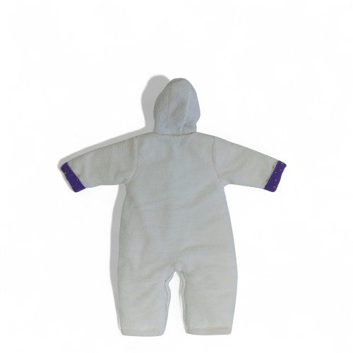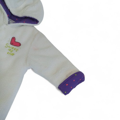 Product Description: Keep your little one snug and stylish in this adorable fluffy baby romper. Made from an ultra-soft, plush material, this one-piece is designed for ultimate comfort and warmth. The classic white color is complemented by charming details, including a vibrant butterfly appliqué on the front and a small red heart embroidered with the phrase "Sweet love." A full-length zipper makes for quick and easy changes, while the contrasting purple trim on the hood and cuffs adds a playful pop of color. The attached hood provides an extra layer of warmth, making this jumpsuit perfect for chilly days and cozy cuddles.