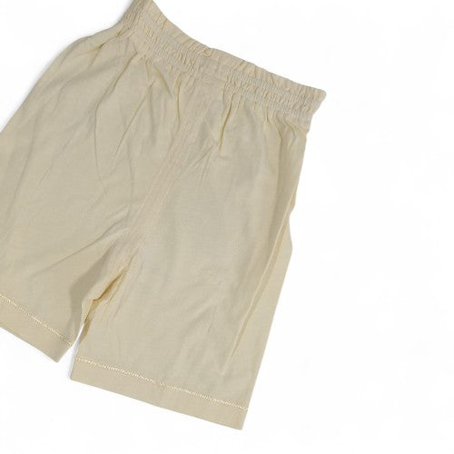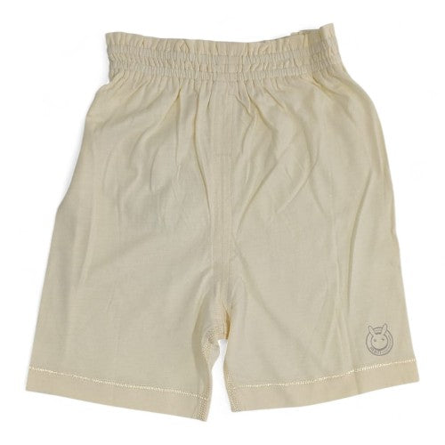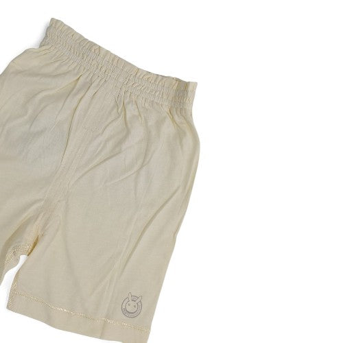 Introduce cozy comfort to your baby's wardrobe with these soft, cream or light beige shorts. Perfect for warm days and active play, they are crafted from a light, breathable fabric, likely100% cotton. The design features anelasticated waistbandfor a gentle, secure fit and a small, charmingembroidered rabbit logodetail on the lower leg. These versatile shorts can be mixed and matched with various tops, making them an essential basic for your little one.