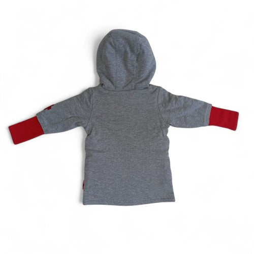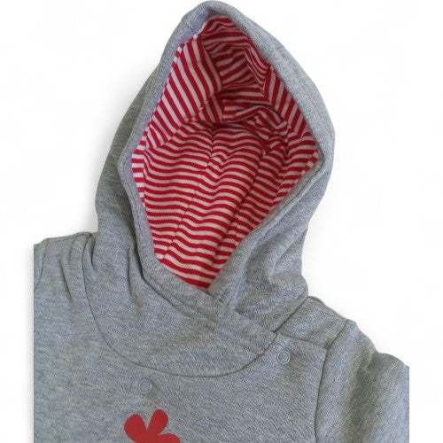 Add a pop of color and charm to your little one's wardrobe with this delightful hooded sweatshirt. Made from a soft, cozy grey fabric, this hoodie is perfect for keeping your baby or toddler warm on cool days. It features a playful, red floral appliqué on the front, along with matching red cuffs and a fun red and white striped lining in the hood. This sweatshirt is both stylish and comfortable, making it a great choice for everyday wear.