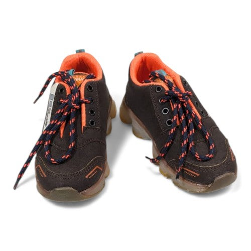 Athletic Design: Features a stylish brown/charcoal upper with contrasting orange highlights for a sporty, modern look.
