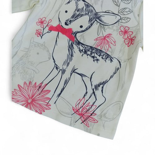 This long sleeve shirt features a beautiful hand-drawn illustration of a fawn surrounded by delicate pink and gray floral designs. The soft, breathable fabric is perfect for keeping your little one comfortable and stylish all season long. Whether they're playing at the park or cozying up with a book, this top is sure to become a favorite.