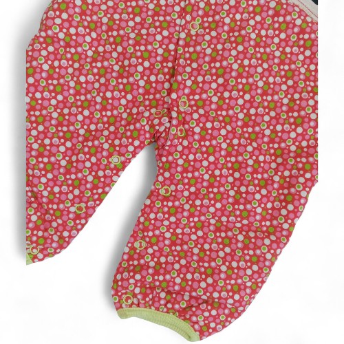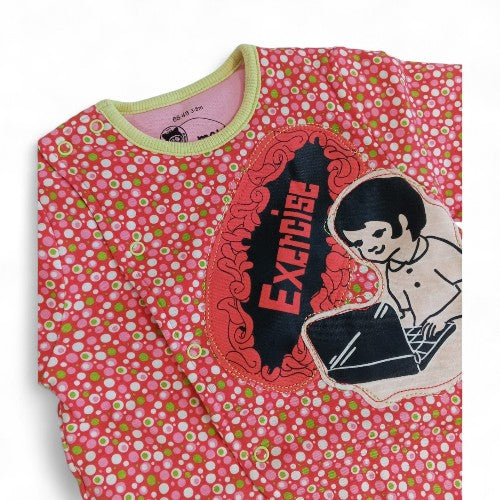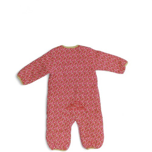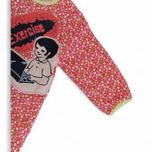 Wrap your little one in cozy comfort with this charming quilted romper. Featuring a whimsical all-over pink floral pattern, this one-piece is perfect for playtime, nap time, or a day out. The standout feature is the unique "Exercise" patch on the chest, showcasing a playful illustration of a person with a retro exercise machine, adding a touch of vintage fun to a classic design.