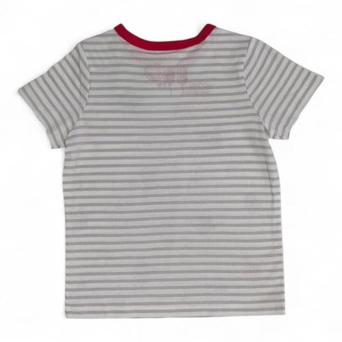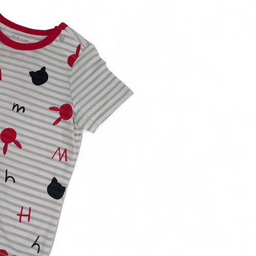 This fun and stylish t-shirt is a perfect addition to any child's wardrobe. The soft, grey and white striped fabric is adorned with a whimsical repeating pattern of black cat heads, red rabbit heads, and the letters 'm' and 'h' in red and black. The bright red trim on the collar adds a pop of color that complements the playful design.