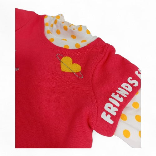 Dress your child in comfort and fun with this unique layered-look t-shirt. The playful design features a bright red, short-sleeve top with an adorable green and white monster appliqué and a small yellow heart accent. The "FRIENDS FR" text on the sleeve adds a special touch. Underneath, a soft, long-sleeve shirt with a cheerful yellow and white polka dot pattern peeks out, creating a stylish and cozy layered effect without the bulk. Perfect for playdates and everyday wear, this shirt is designed to be both durable and comfortable for your child's active life.