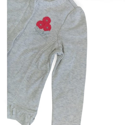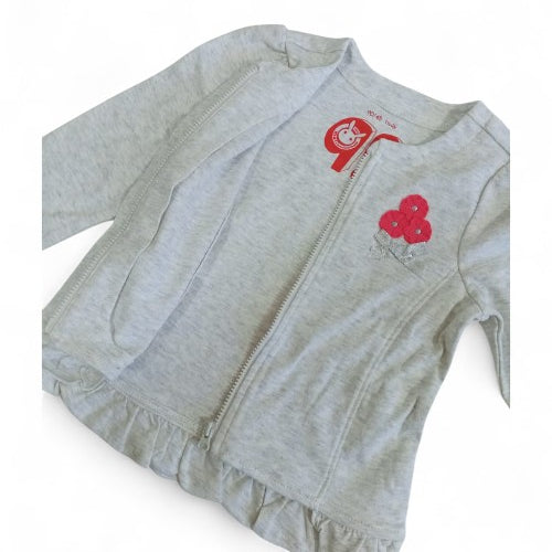 This cozy and versatile heather grey hooded cardigan is a perfect staple for your little one's wardrobe. Made from a soft, comfortable knit fabric, it's designed to provide warmth without being bulky, making it ideal for layering. The full-zip front allows for easy dressing and temperature regulation, while the ribbed cuffs and hem ensure a snug and comfortable fit. A small, distinctive red and white embroidered emblem on the chest adds a touch of charm and style.