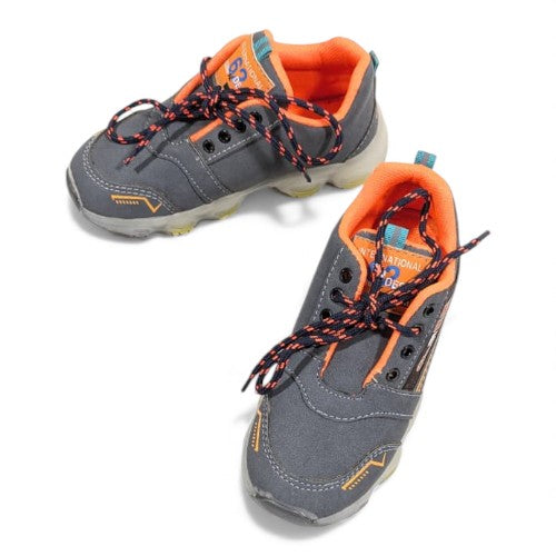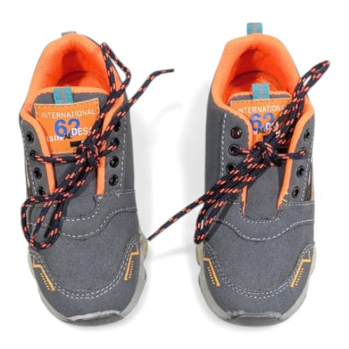 Get ready for action with these stylish grey and orange "SPORT." sneakers! Designed for high energy and fun, these shoes feature a sleek athletic design with vibrant orange accents on the laces, lining, and stitching. The bold text "SPORT." is featured on the side, emphasizing an active lifestyle. This not only makes playtime more fun but also adds visibility for safety during evening activities.