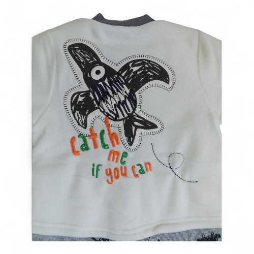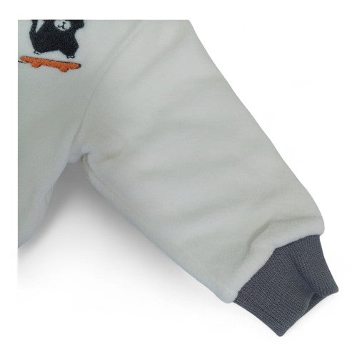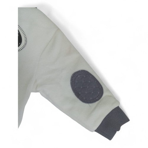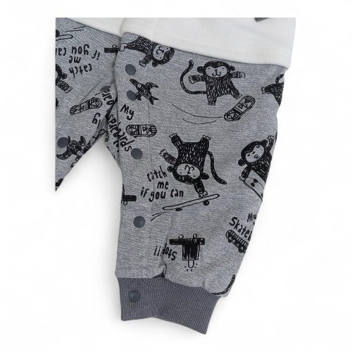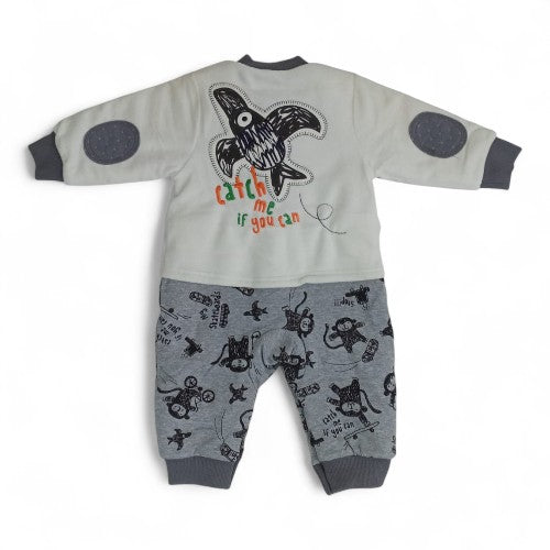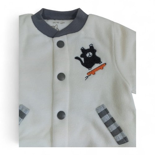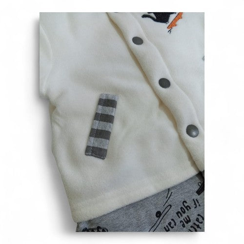 Body: This charming two-piece outfit combines comfort and fun for your baby or toddler. The soft, padded white bomber-style jacket features a cute bear graphic and snap buttons for easy dressing. The matching grey jogger pants are covered in a playful print of cartoon bears and other whimsical characters, complete with cuffed ankles to keep them in place.