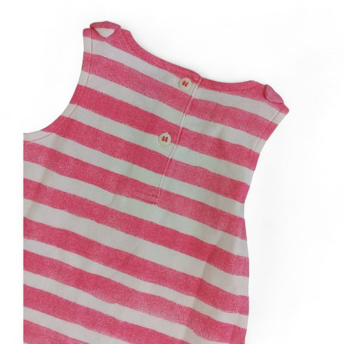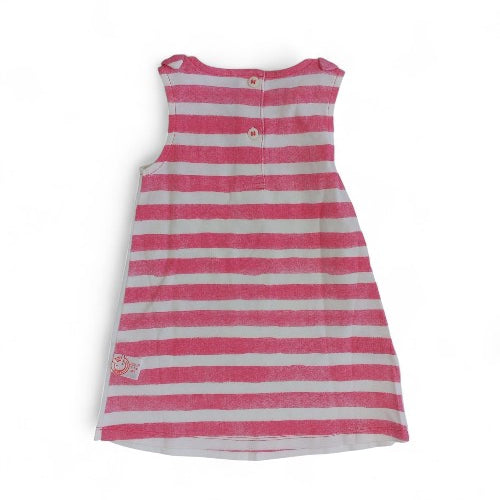 This darling sleeveless dress is the perfect blend of cute and comfortable for your little one. The crisp white fabric is adorned with an endearing graphic of a friendly cartoon bear, accented by soft pink and yellow flowers in a charming, hand-painted style. The adorable ruffle-detailed straps and contrasting pink stitching at the hem add a pop of color and a playful touch.Made from a soft, breathable material, this dress is ideal for keeping your baby cool and happy on warm days. Its simple, pull-on design makes dressing quick and easy, while the cheerful graphic ensures your little one looks as sweet as can be.