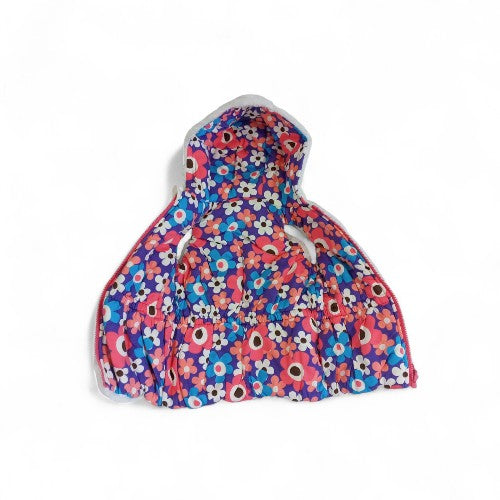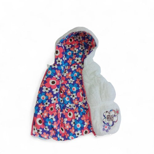 What makes this vest truly special is its two-in-one design. The inside of the hood and the lining feature a cheerful, multi-colored floral print, which can be reversed to show off a completely different look. A small floral graphic with "MAI RIO" lettering on the pocket adds a charming and unique detail. This vest is a perfect addition to any little one's wardrobe, offering both comfort and two unique styles in one.